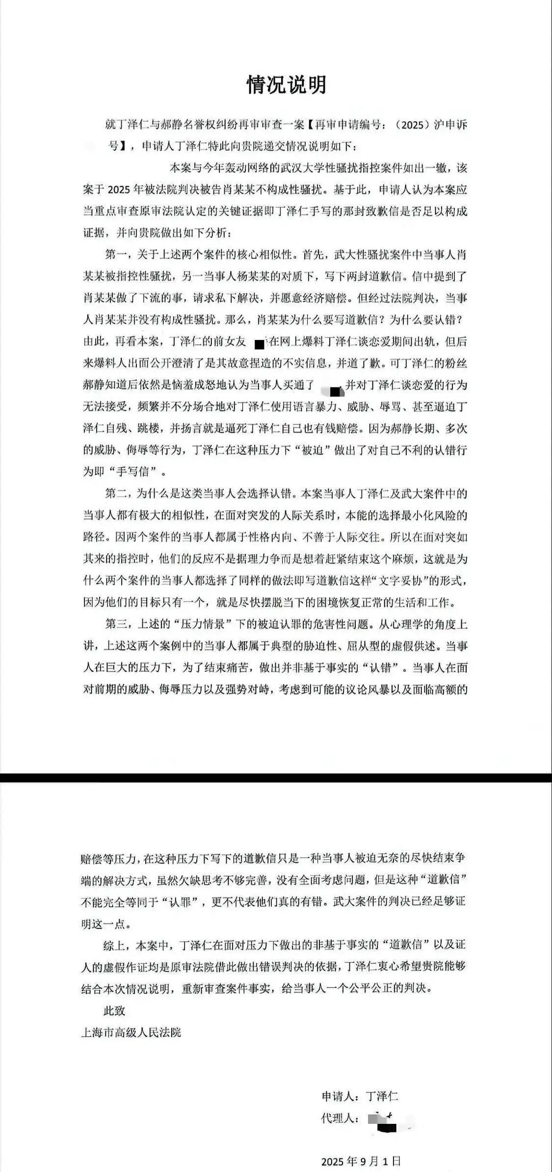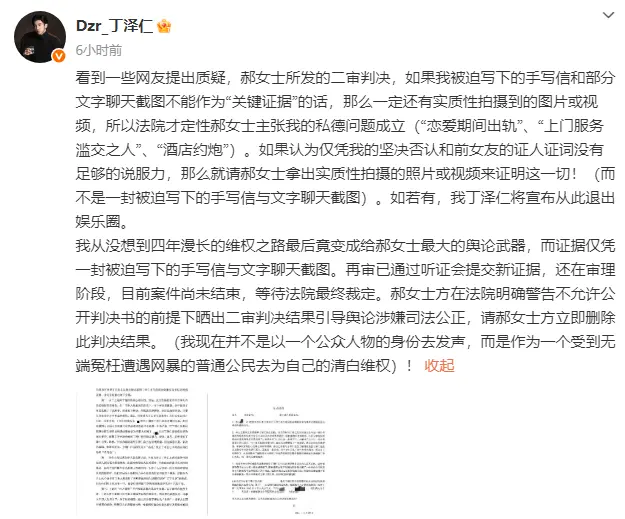 11月24日,丁泽仁发文公开喊话“唯一的姐”郝女士一方,要求其立即删除二审判决结果。他在文中明确指出:“郝女士方在法院已明确警告不允许公开判决书的前提下,仍执意晒出二审判决结果并借此引导舆论,此举已涉嫌影响司法公正,请郝女士方立刻将该判决结果删除。”