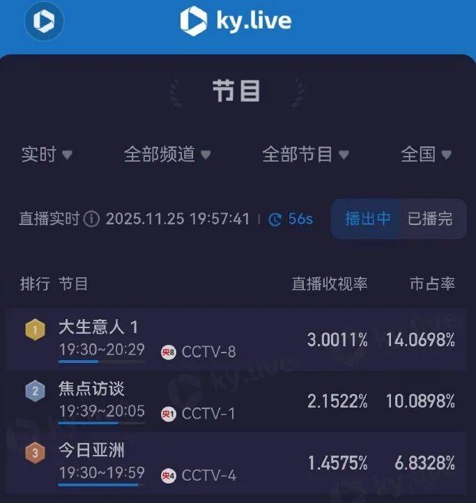 该剧于2025年11月25日19:30在CCTV-8首播,开播15分钟关注度达3.29%(猫眼数据),27分钟内实时收视率突破3%,峰值达3.2%,成为央八史上最快破3的剧集。