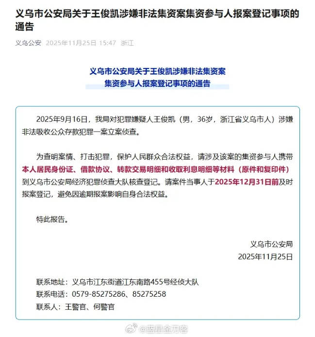 义乌市公安局于2025年11月25日发布通告称,2025年9月16日已对犯罪嫌疑人王俊凯(男,36岁,浙江义乌人)涉嫌非法吸收公众存款案立案侦查。警方明确要求集资参与人于2025年12月31日前提交材料报案登记,逾期将影响自身权益。