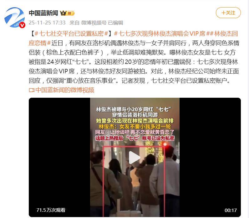 截至目前,林俊杰经纪公司仍未正面回应,仅强调他“重心放在音乐事业”。而记者发现,事件发酵后,七七的社交平台账号已转为私密状态。这场从演唱会VIP席蔓延至现实生活的“跨国同行”,究竟是偶像的私事自由,还是人设与粉丝期待之间的拉锯?也许答案,只有时间能给出。