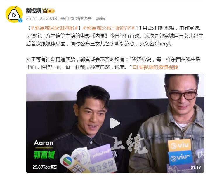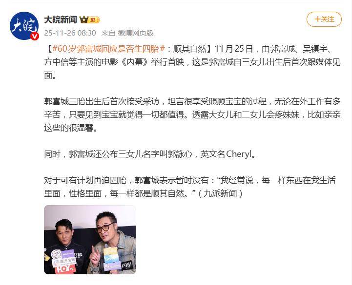 据11月25日报道,郭富城一句“顺其自然”的回应,瞬间点燃了全网对他家庭计划的好奇心。在11月25日其主演电影《内幕》的香港首映礼上,刚迎来三女儿满月不久的他,首次公开面对媒体,也首次正面回应了是否会“再追四胎”这个焦点问题。