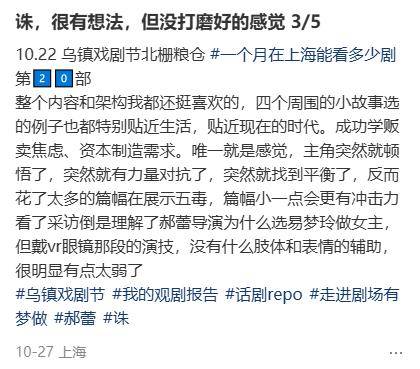 不只是美商遭到诟病,她出演郝蕾的话剧时,也被很多网友视为“强捧之耻”,她的台词、肢体语言都很生涩,在她的反衬下,其他几位专业演员显得格外出众。