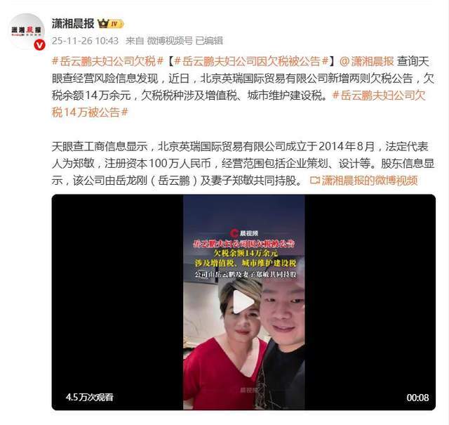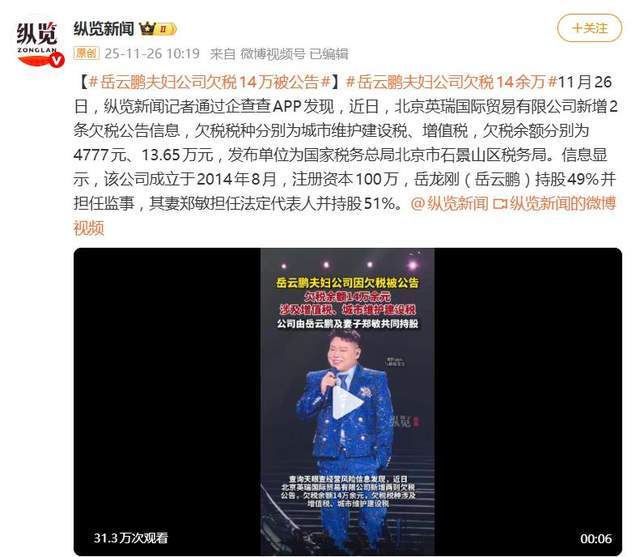 据11月26日报道,近日,企查查APP信息显示,北京英瑞国际贸易有限公司新增两条欠税公告,欠税余额合计约14.13万元,其中增值税13.65万元,城市维护建设税4777.5元。发布单位为国家税务总局北京市石景山区税务局,公告日期为2025年11月24日。这家成立于2014年的公司,股权结构清晰可见:岳云鹏(本名岳龙刚)持股49%并担任监事,而其妻郑敏则持有51%的股份,并担任法定代表人。