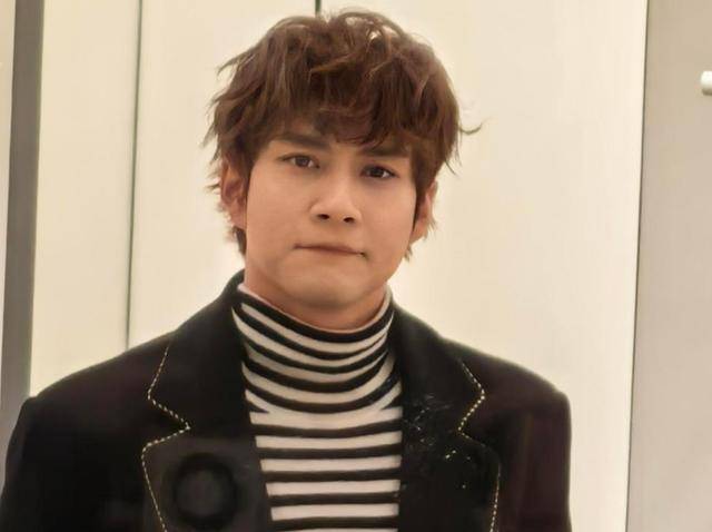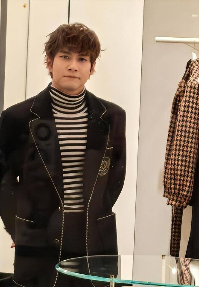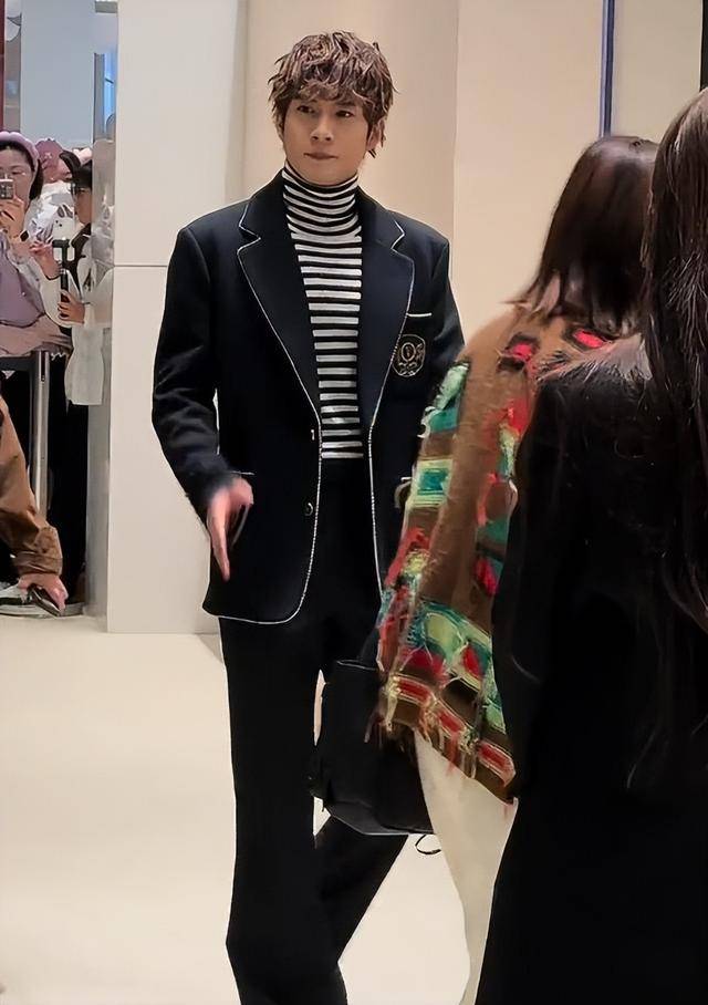 他穿了一件黑白条纹的高领毛衣,搭配黑色西装外套,版型挺括却没撑起气场。