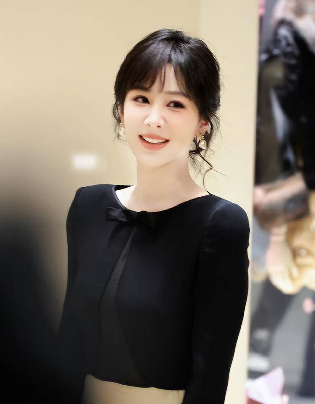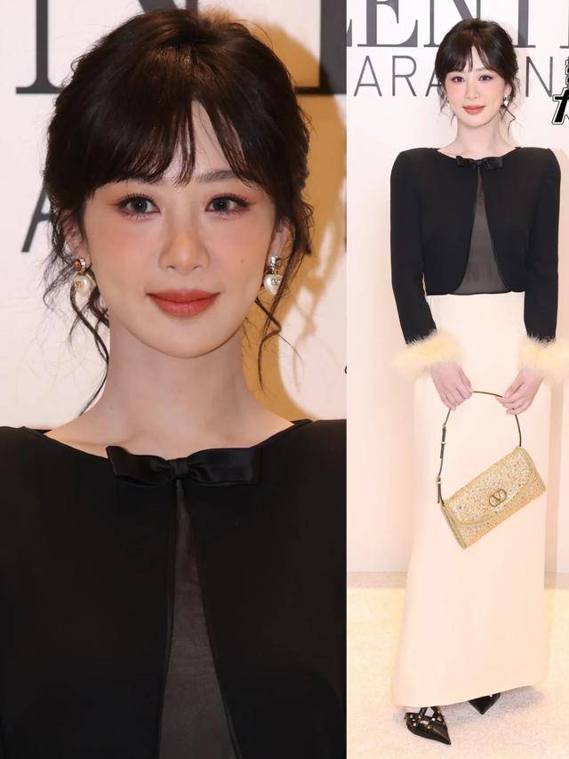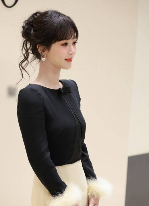 杨紫穿了一件黑色衬衣搭杏色亲自,裙摆到脚腕,衣服的领口还是优雅的圆领设计,刚好修长的天鹅颈。