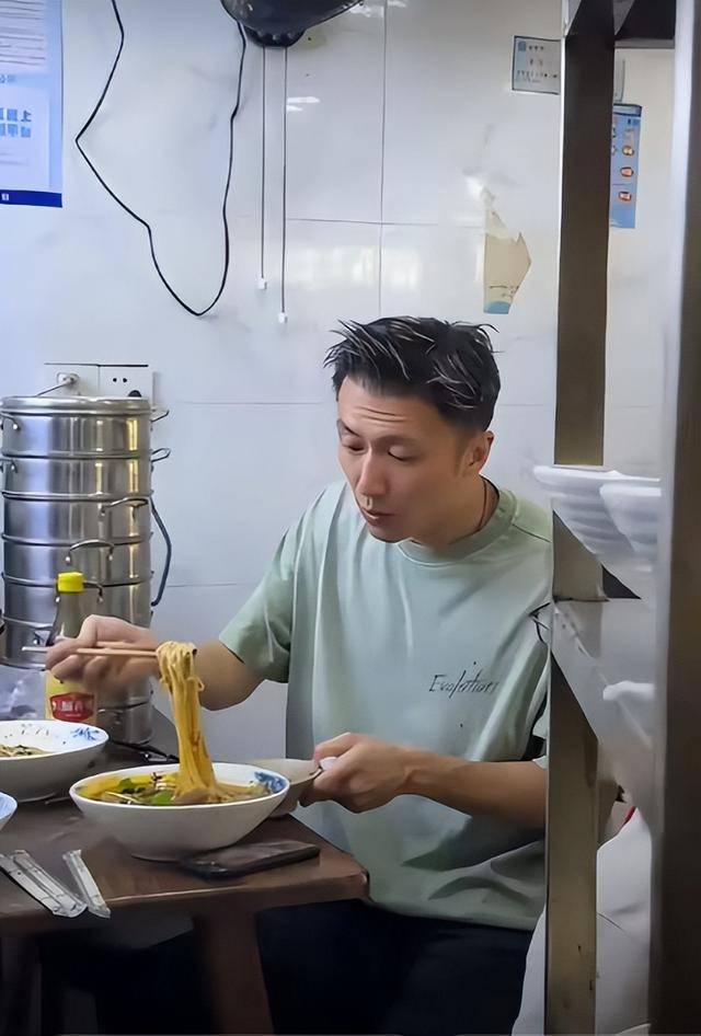 年初在重庆吃小面,被粉丝拍到,他穿短袖低调坐路边摊,碗里热气腾腾的,动作自然得像本地人。