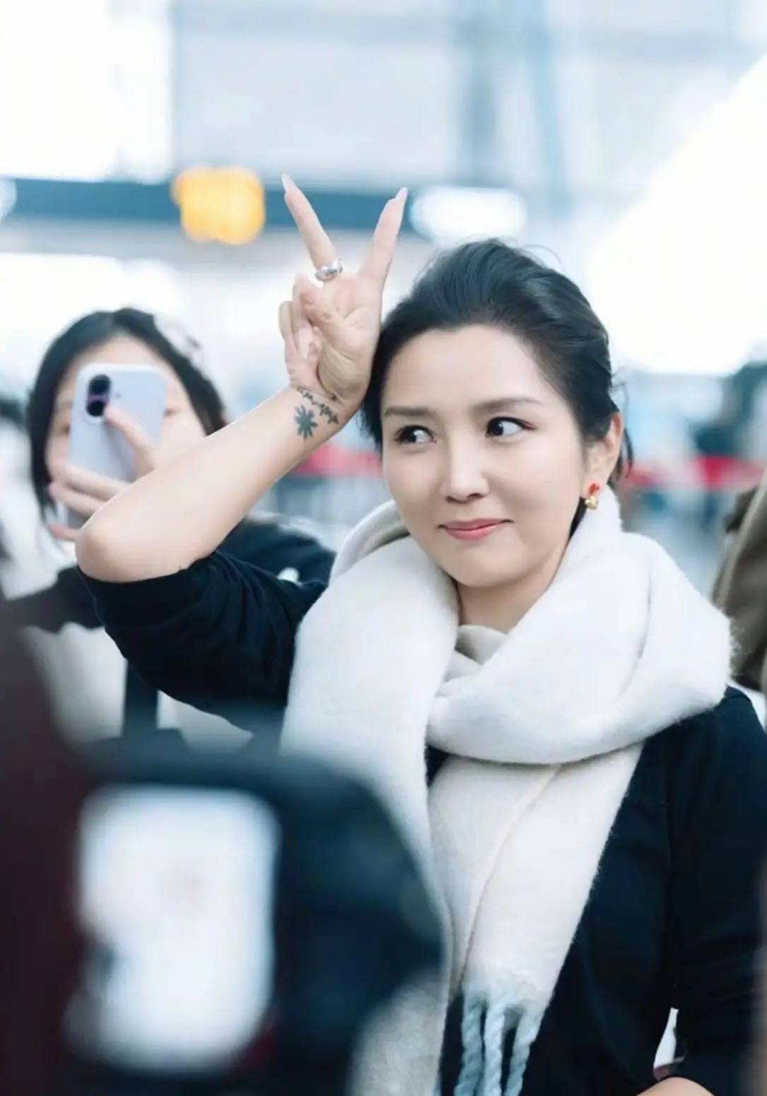 何洁的白色围巾,也很显气色。手上戴着铂金戒指、手腕上露出纹身,对着镜头比耶的模样好可爱。