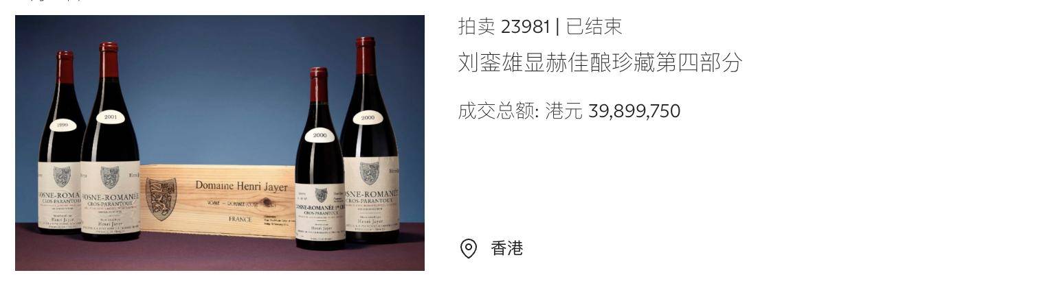 刘銮雄第四度携手佳士得举办佳酿拍卖会,此次他拿出了155件佳酿,估值约2800万。就佳酿的件数以及估值,第四部分不如第三部分,不过依然有不少珍品佳酿被展示。据佳士得公开的信息了解,此次被拍卖的佳酿中最珍贵的依然是Henri Jayer,这是刘銮雄购自2012年《佳士得名酿:Henri Jayer私人窖藏》的佳酿,其中估价最高的是六瓶750ml的Henri Jayer,Vosne-Romanee Cros Parantoux 2001以及三瓶装的1.5L的同款2001年份的Henri Jayer,估价在90万至130万之间。