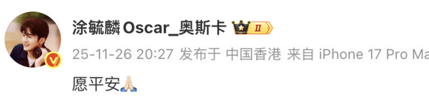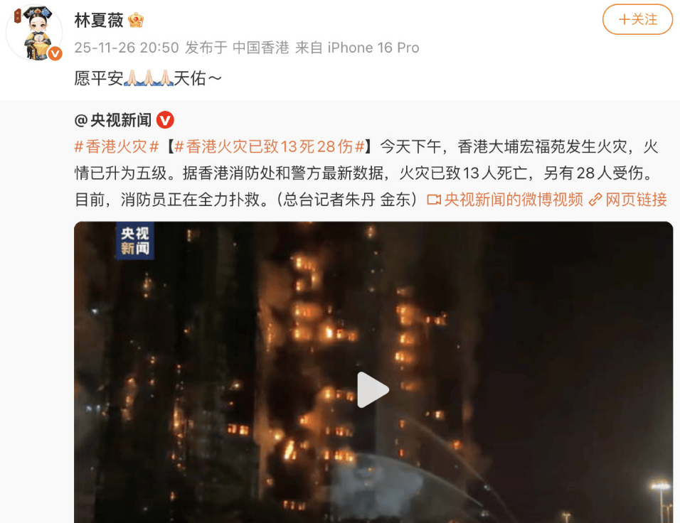 11月26日下午,香港大埔宏福苑发生火灾。欧阳震华、林夏薇、奥斯卡等发文为火灾中的的受灾人民祈福, 欧阳震华写道:“天佑香港,天佑大埔”。愿平安!
