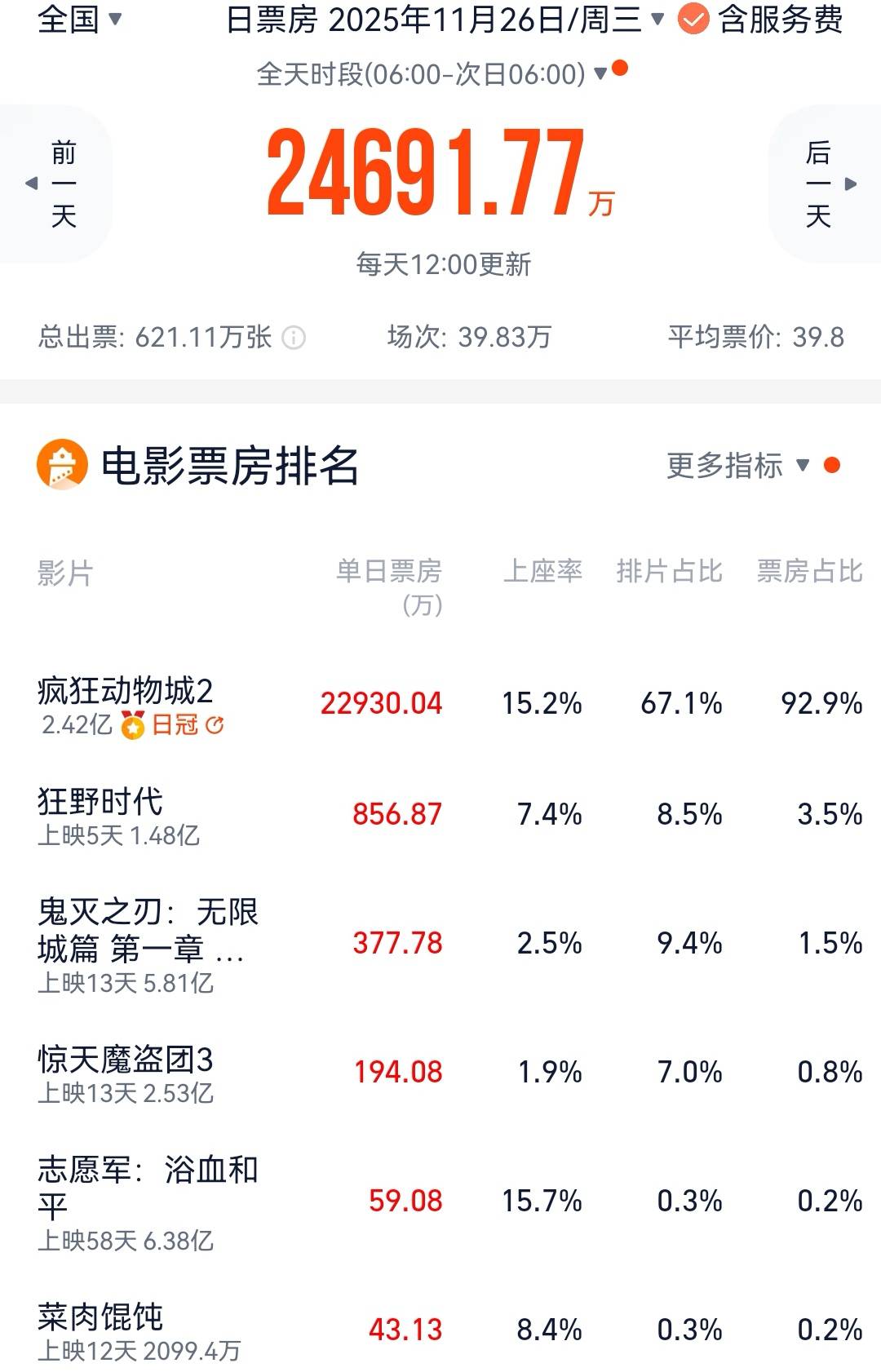 11月26日(周三),迪士尼动画电影《疯狂动物城2》上映,首日排片占比67.1%,收票房近2.3亿元,上座率15.2%。《疯狂动物城2》成为继《姜子牙》《熊出没·逆转时空》《哪吒2》之