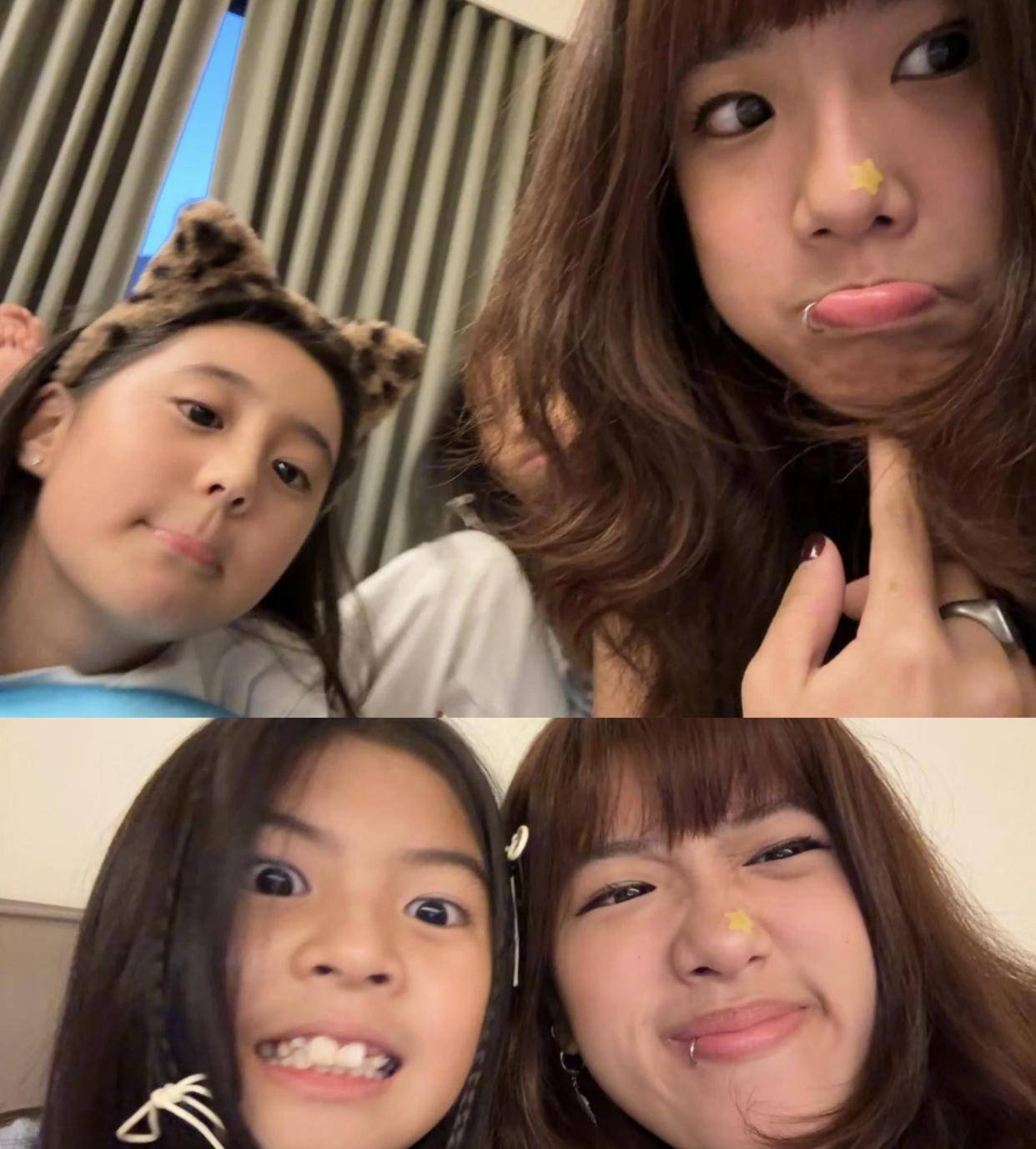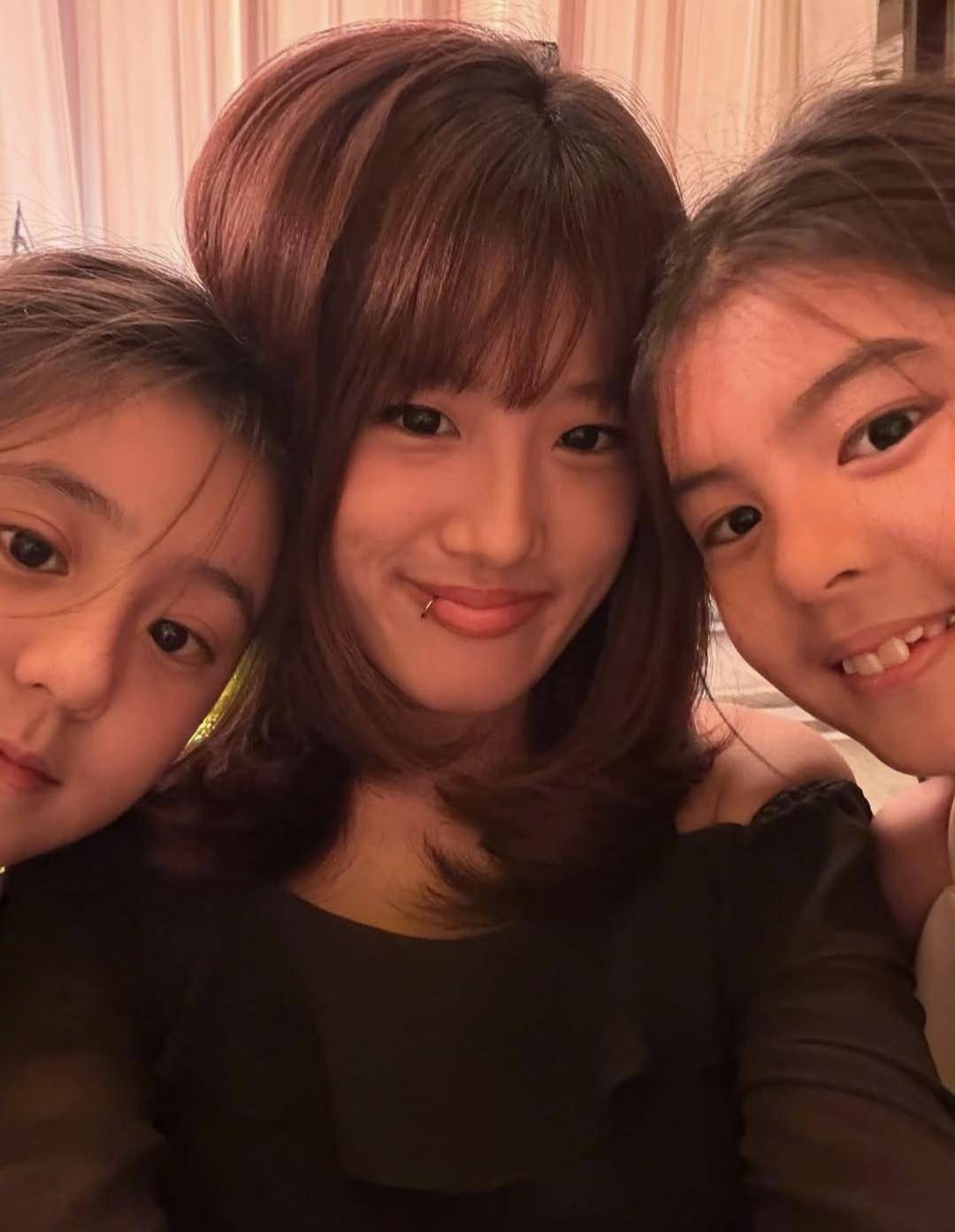 梧桐妹拉着两个妹妹一起自拍,波妞和姐姐总是笑得灿烂,侧脸和修杰楷几乎一模一样。咘咘乖巧又懂事,靠在姐姐身边,显得很文静稳重。