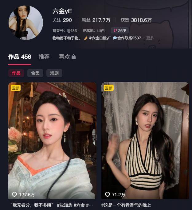 还有另外一位短剧女演员“六金叶”,在抖音平台上有着200多万的粉丝,每条视频点赞都在一万以上。