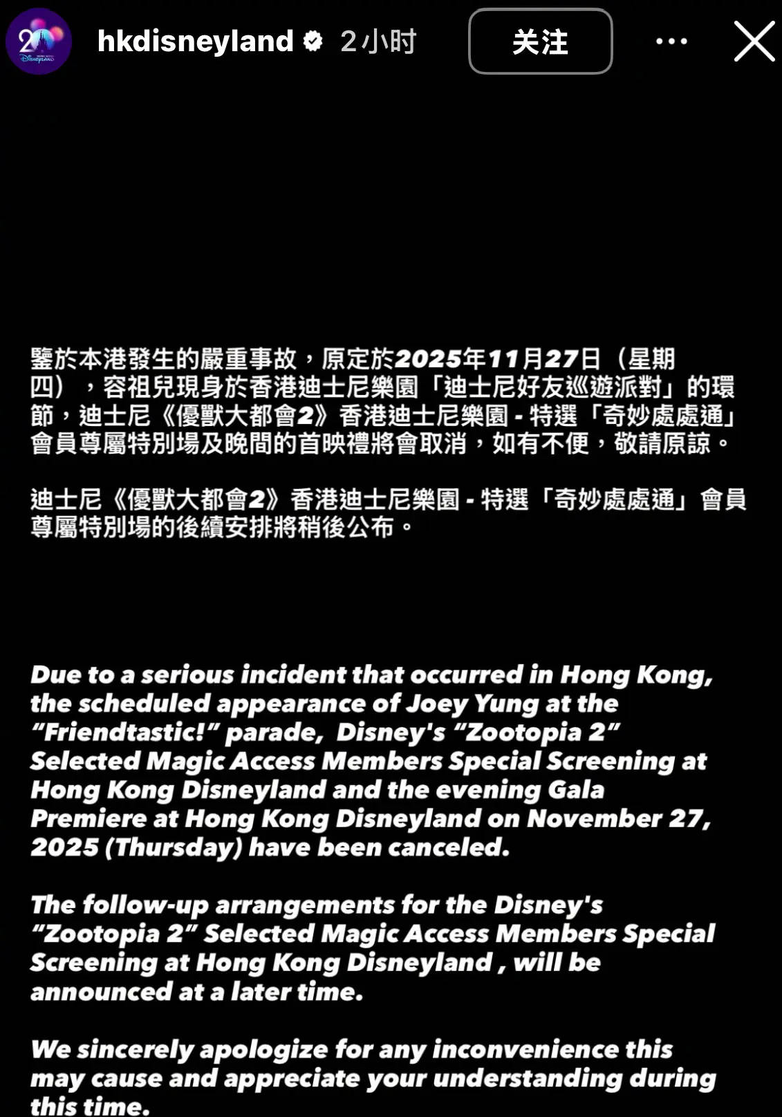 11月27日,据香港迪士尼消息,鉴于香港发生严重火灾,原定于今日,容祖儿现身港迪参加的《疯狂动物城2》首映礼取消。港迪给会员安排的后续活动将于稍晚公布。此前,容祖儿发文为香