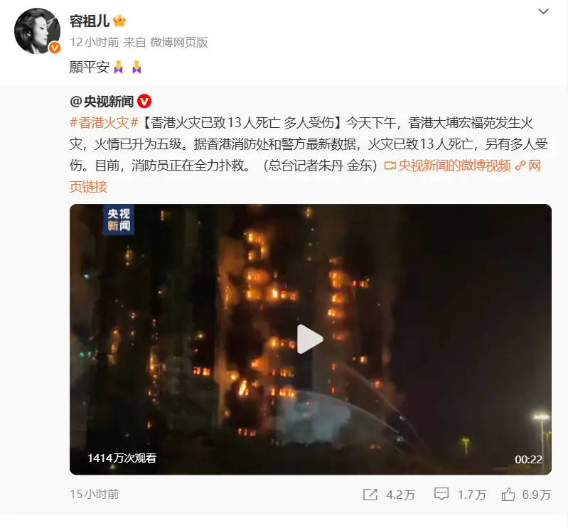 此前,容祖儿发文为香港同胞祈福:“愿平安。”