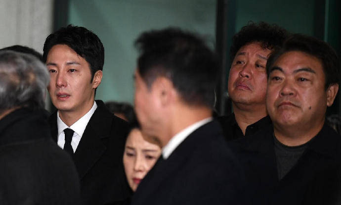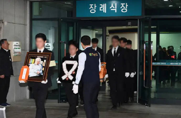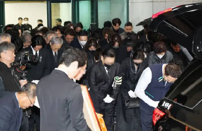 27日,演员李顺载在首尔殡仪馆出殡。李顺载家人、演艺圈朋友、后辈等出席仪式。全员身着黑色西装,肃穆送别李顺载最后一程。