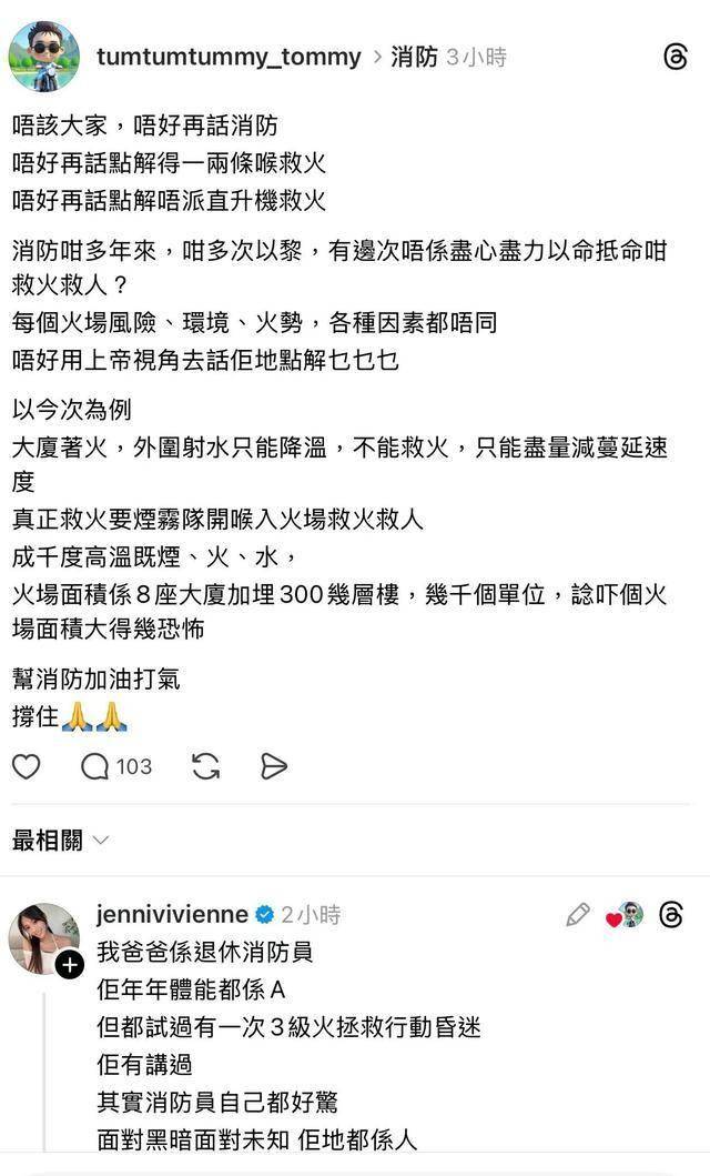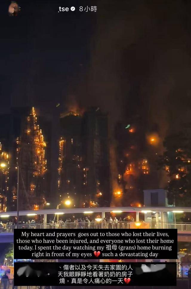 前港姐冠军谢嘉怡的祖母,正是受灾大厦的其中一名业主,谢嘉怡在社交网发文,透露自己看着祖母的房子在熊熊烈火中燃烧。