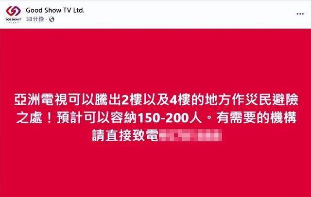 而位于大埔区的“亚洲电视”则表示,“可以腾出2楼以及4楼的地方作灾民避险之处!预计可以容纳150~200人”,指有需要的机构可致电。