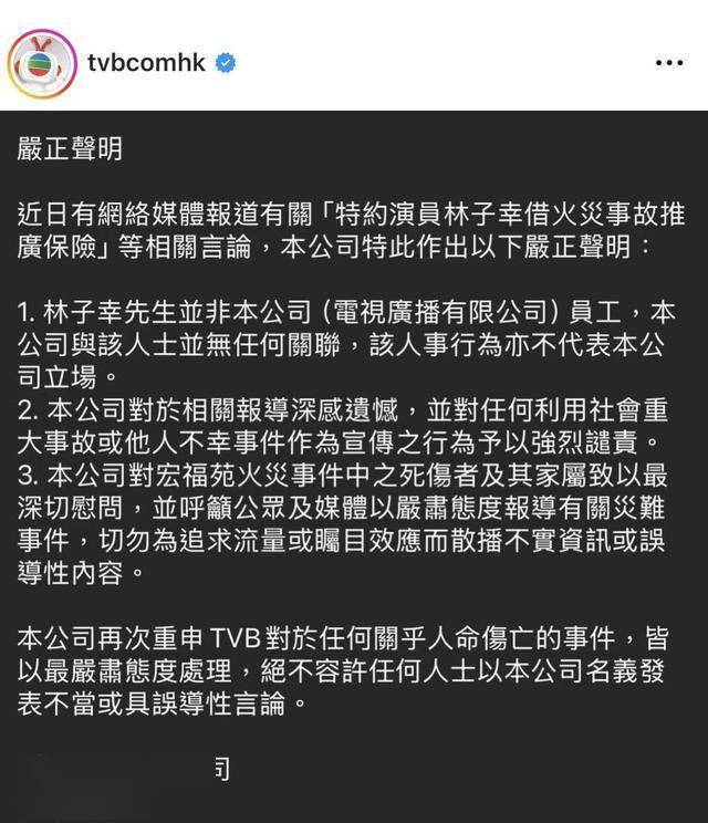 他的做法让大众反感,而TVB也反应迅速,在27日凌晨发声明表示,林子幸并不是TVB的艺人:本公司与该人士并无任何关联,该人事行为亦不代表本公司立场。