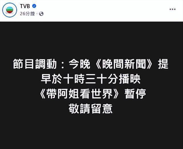 另外,TVB在26日晚,暂停播出原定的旅游节目《带阿姐看世界》,改为关注火灾事件。