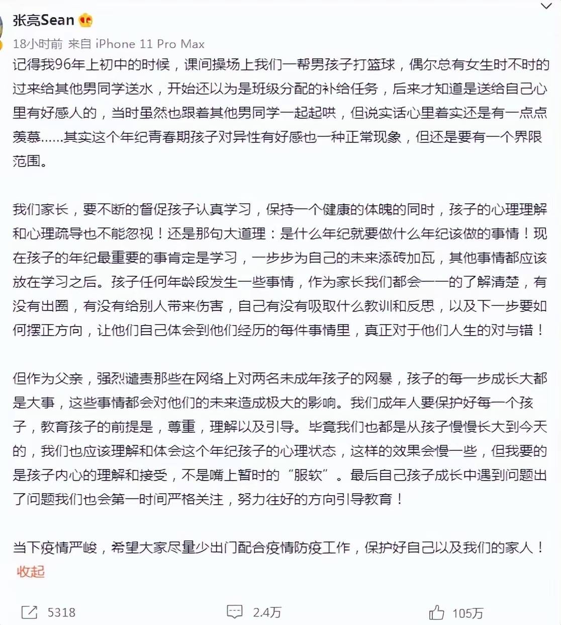 在张亮的长文中,没有丝毫对儿子的担心,反而是谴责了那些对两名未成年孩子网暴的人。说实话,青春期的心动是难得的。