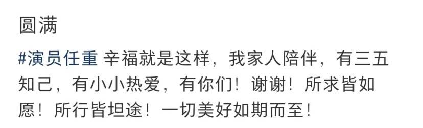 他说幸福就是这样,我家人陪伴、有三五知己、有小小热爱、有你们!所求皆如愿、所行皆坦途,一切美好如期而至。