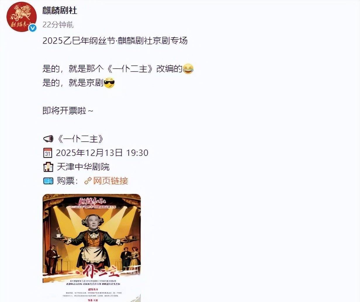 在郭德纲的带领下,德云社将意大利喜剧《一仆二主》搬上了京剧舞台,用传统戏曲的方式来演绎。这场以京剧形式呈现的改编作品,会在纲丝节期间于中华剧院亮相,时间定在12月13日,也