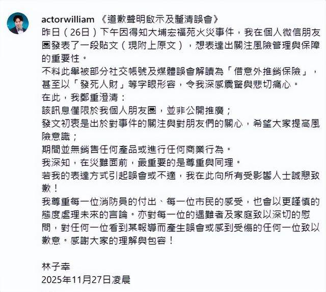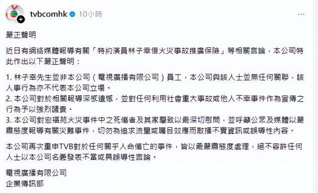 随着该事件的不断发酵,TVB企业传讯部发出严正声明,对林子幸借火灾事故推广保险一事做出澄清,TVB称林子幸并非TVB员工。