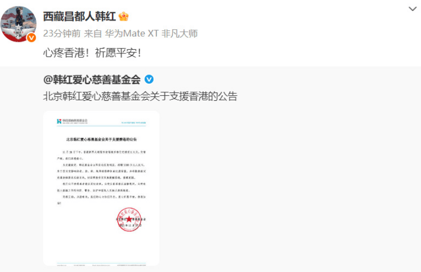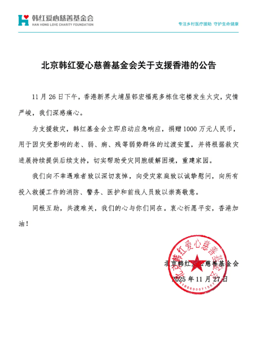 11月27日,韩红基金会今日宣布捐赠1000万元支援香港:“为支援救灾,韩红基金会立即启动应急响应,捐赠1000万元人民币,用于因灾受影响的老、弱、病、残等弱势群体的过渡安置,