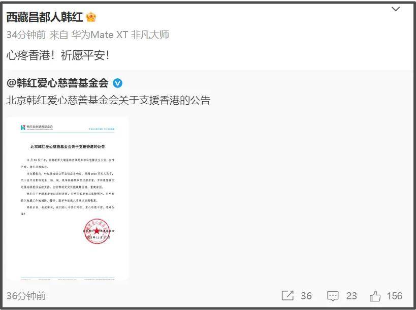 韩红本人也是第一时间转发基金会捐款公告,留下一句:“心疼香港!祈愿平安”————韩红基金捐出的一千万汇集多方力量,希望能帮助到更多人吧。