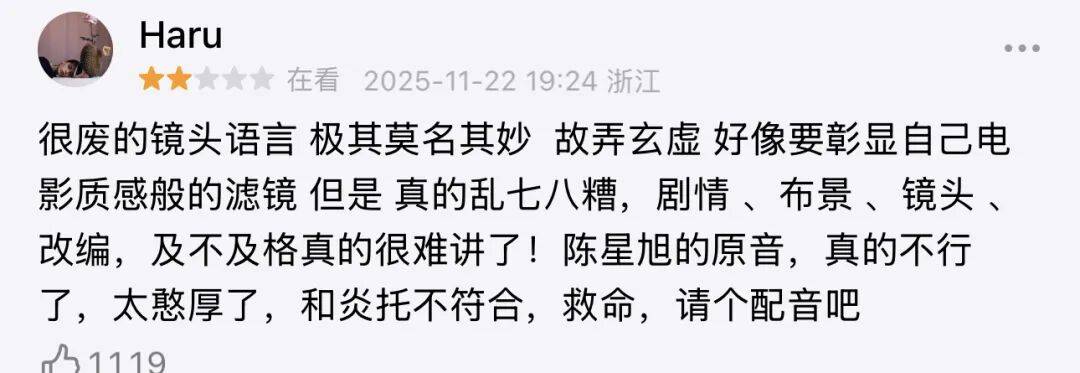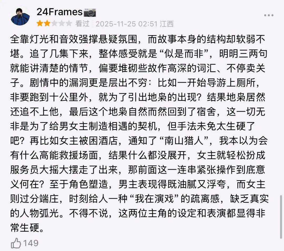 制作层面也没少遭到诟病,镜头语言被批“故弄玄虚”,暗黑滤镜本想营造电影感,结果夜戏“乱七八糟”、“根本看不清”;