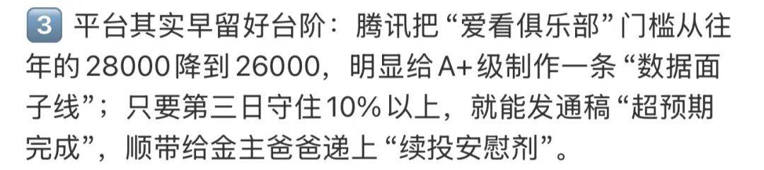 而平台的后续操作,更是坐实了这种观感,先是腾讯将“爱看俱乐部”达标线从28000下调至26000,被外界解读为给这部A+级剧“数据放水”;(但实际上好几个月前达标线就下降了