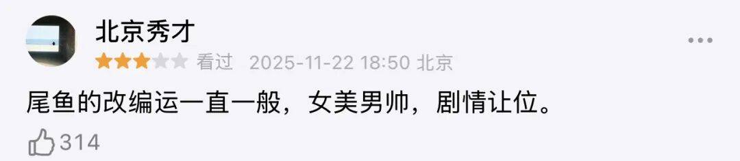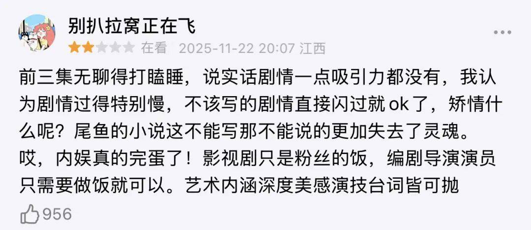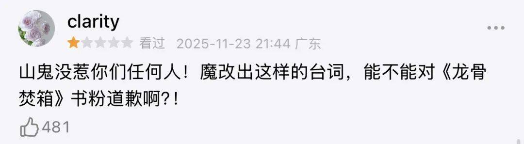 另一边则是大量一星差评集中轰炸,骂得那叫一个整齐划一。原著党怒气值彻底爆表,不仅狂喷“人设崩塌、主线砍半”,四十万字原著被魔改时间线,“爱即催命”的宿命感全被稀释,更有《龙骨焚箱》书粉怒怼“魔改台词,该道歉”,直言尾鱼小说的“魂”都被改没了。