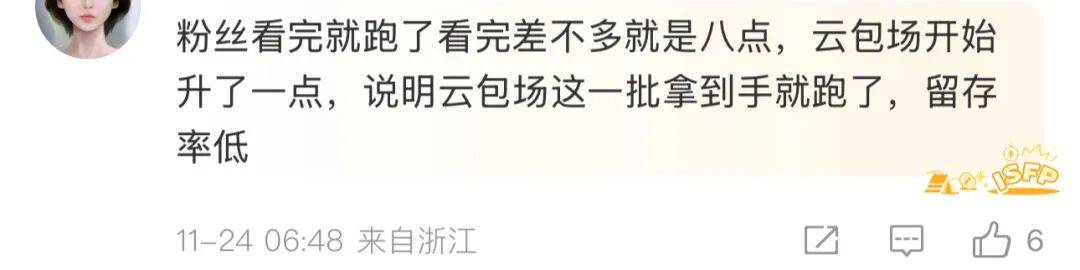 特别是伴随着粉丝“云包场”等现象的出现,很多网友猜测,这波热度掺了不少水分,真实观众压根没留住多少,全靠着粉丝硬撑场面。