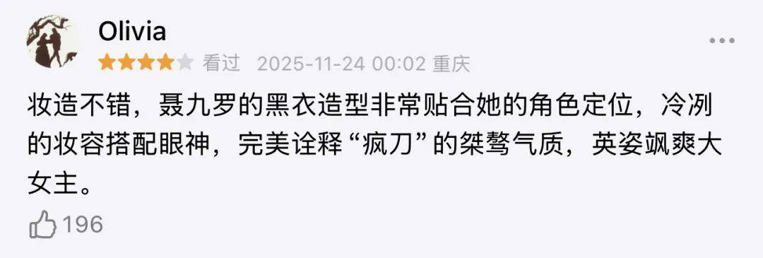 迪丽热巴本人也被反复肯定,黑衣造型贴合“疯刀”人设,原声台词加持代入感强,和男主的CP感更是意外出圈。