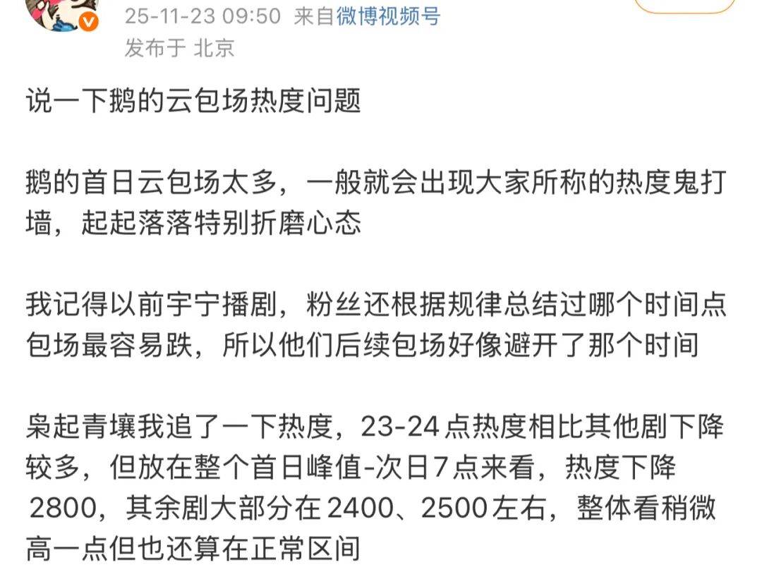 开播初期的热度过后,剧集在黄金时段出现了非常规的负增长,工作日白天时段的热度也持续回落,一度跌破20000的基准线,引发了关于剧集真实热度的讨论。