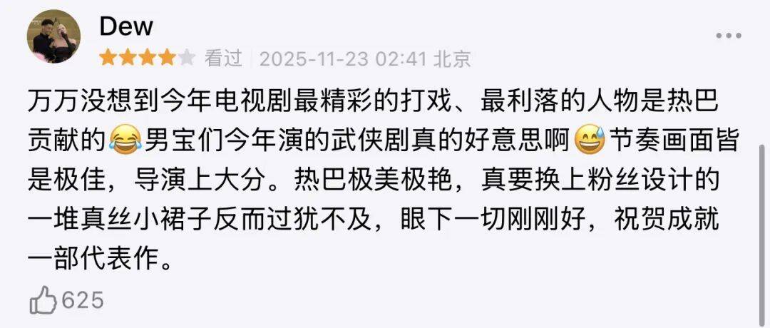 打戏更是被直接封上“年度最佳”,清一色好评夸“今年电视剧最精彩的打戏、最利落的人物是热巴贡献的”,成家班指导的雨林刀战长镜头、雨中40秒连劈招式又飒又狠,战损妆圈粉无数。