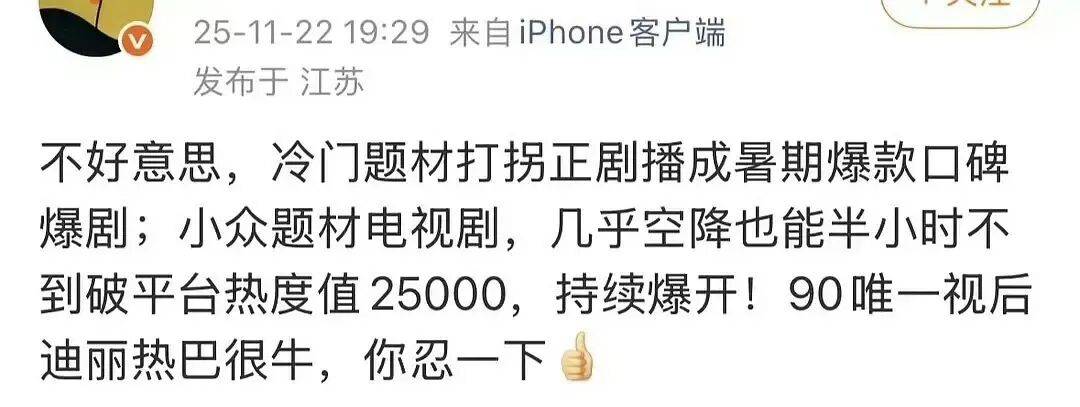 咬死《枭起青壤》题材太过冷门、先天就不具备爆款的,反复强调几乎空降开播、平台根本不给活路的,直接主张“迪丽热巴到了这个位置,早就不需要用爆剧来证明自己了”的......主打一个逻辑闭环,坚不可摧。