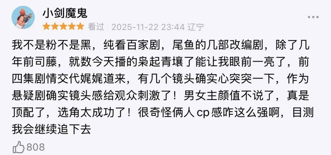 一边是直接“封神”的盛赞,有人直接把聂九罗夸成“艺术与杀戮的完美平衡”,剧情“诡谲连绵、单刀直入,没有不看的理由”;纯路人也狠狠共情,说是继《司藤》后尾鱼IP改编的又一佳作,前四集“娓娓道来,镜头感能带来心跳刺激”。