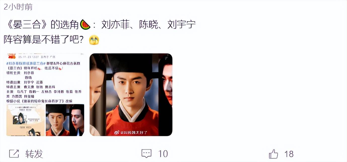 《梦华录》成为爆剧后,让很多网友都成为刘亦菲和陈晓的CP粉丝,如果他们再次合作,绝对会让这部剧自带关注度,刘宇宁的加入,会给这部剧锦上添花,各位读者,看到网传的《晏三合》阵容,你们期待这部剧吗?