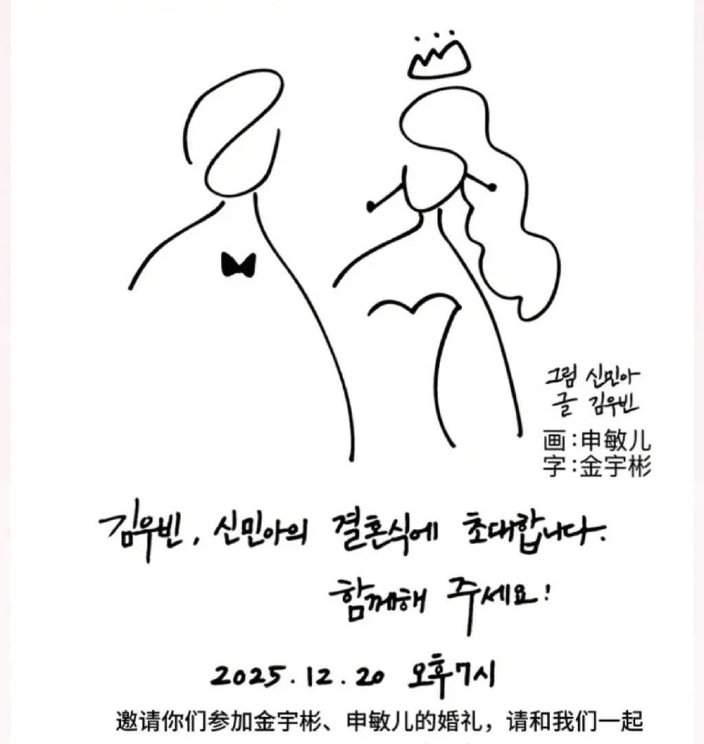 11月27日,金宇彬、申敏儿婚礼请帖公开,是简笔画+手写字的形式,上面还标注画来自申敏儿,字来自金宇彬,“诚邀您来参加金宇彬、申敏儿的婚礼,请和我们一起!2025.12.20 下午7点”。