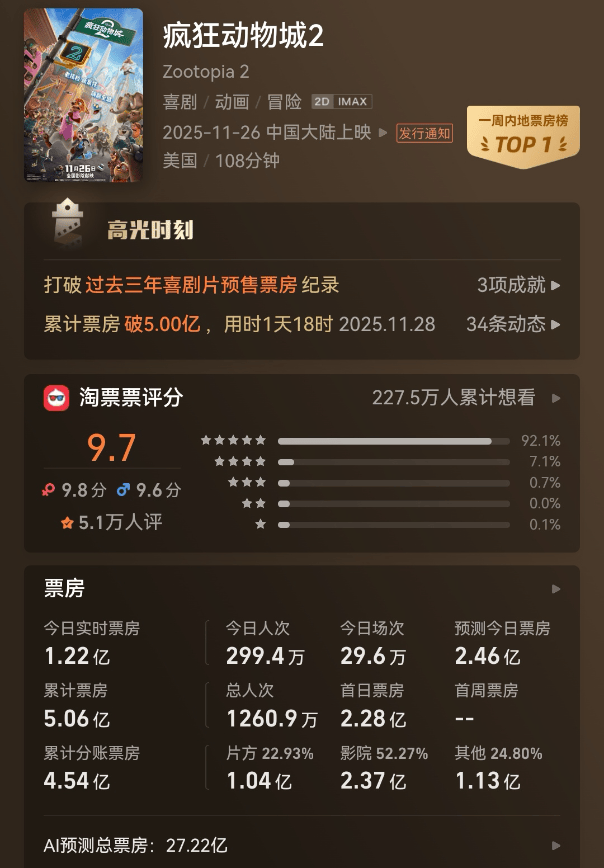 11月26日(周三),迪士尼动画续作《疯狂动物城2》上映,首日票房2.28亿元,上座率14.9%,次日票房1.43亿元,上座率9.2%。