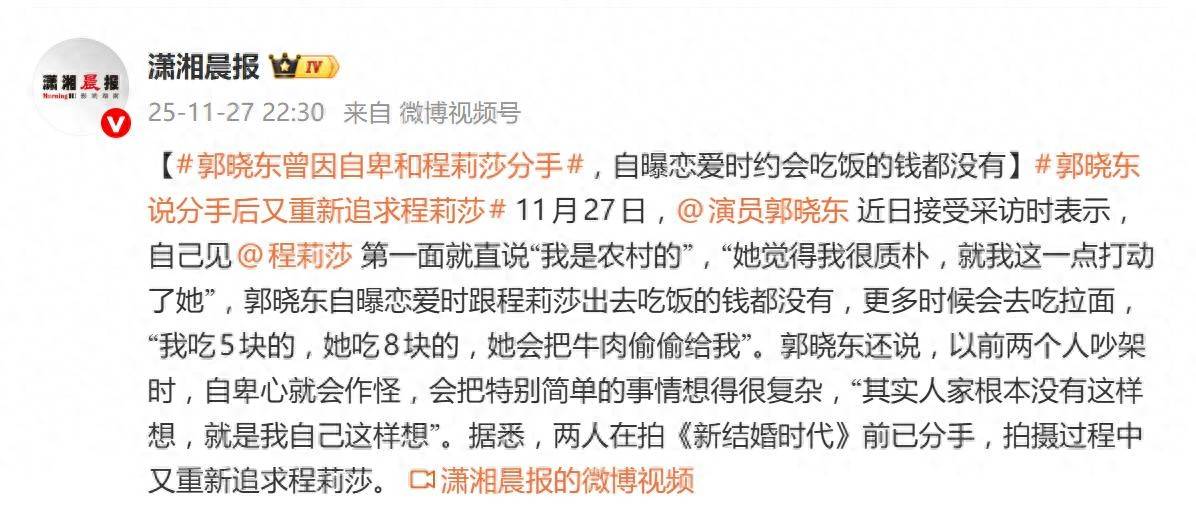 有意思的是,正是这部讲述城乡差异婚姻的剧,成了两人关系的转机——拍摄过程中,郭晓东重新追求程莉莎,最终修成正果。戏里戏外,他们仿佛都在破解同一道题:当爱情撞上现实差距,到底什么才是真正的“门当户对”?