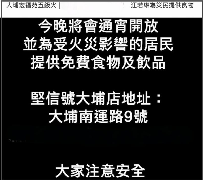 得知火灾消息之后,江若琳通过社媒平台对外表示会调整自家餐厅工作时间,改为通宵营业,还会为受到火灾影响的居民提供免费食物和饮品。