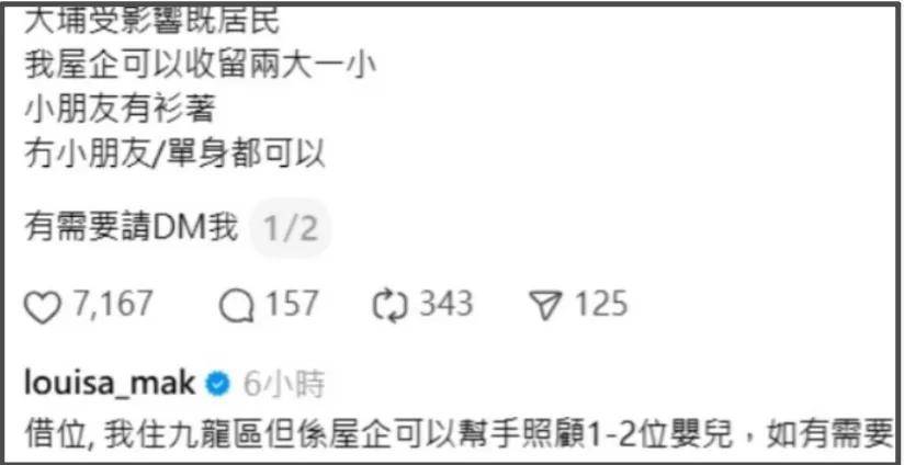 港姐麦明诗第一时间呼吁招募义工,随后更是发布动态提供自家位置,对外喊话可以帮忙照顾一到两个婴儿。