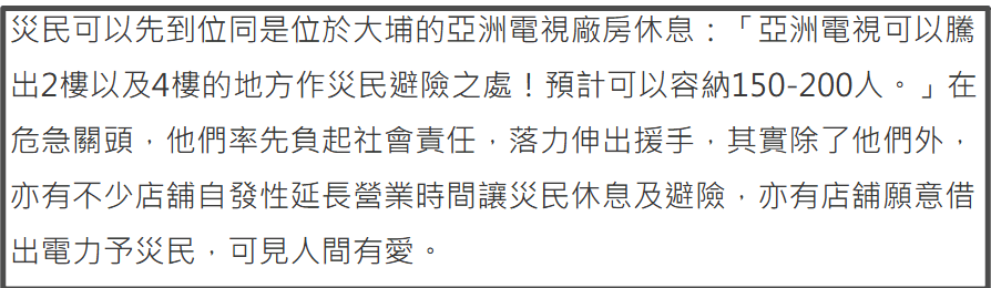 为受灾民众提供援助的还有港圈业内,大埔附近的本地电视台腾空两层楼,预计可以容纳150到200人。