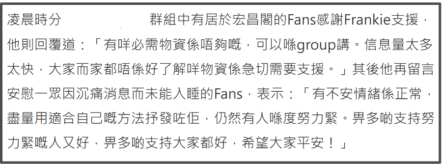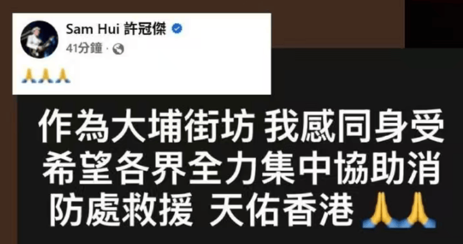 ——77岁歌手许冠杰亲笔写下手写信呼吁各方支持救援,强调自己亦是大埔街坊,还有女偶像留言安慰周边被烧毁的粉丝,都属于精神慰藉,和物质援助一样重要。