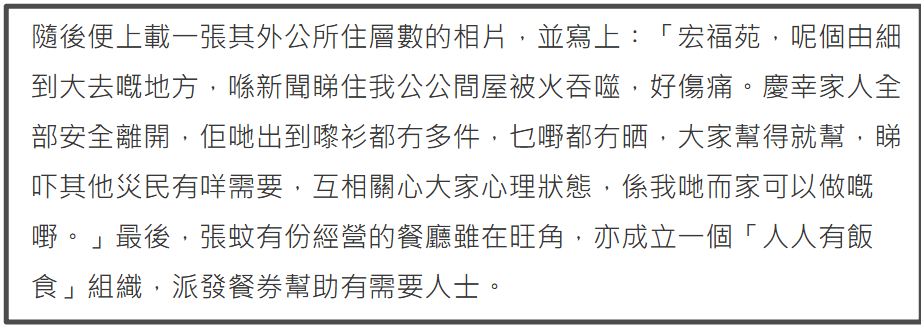 知名业内张蚊的外公家就在大埔宏福苑,她获得过六次金像奖提名,从小在宏福苑长大,看到充满童年回忆的地方被大火吞噬,内心充满伤痛。