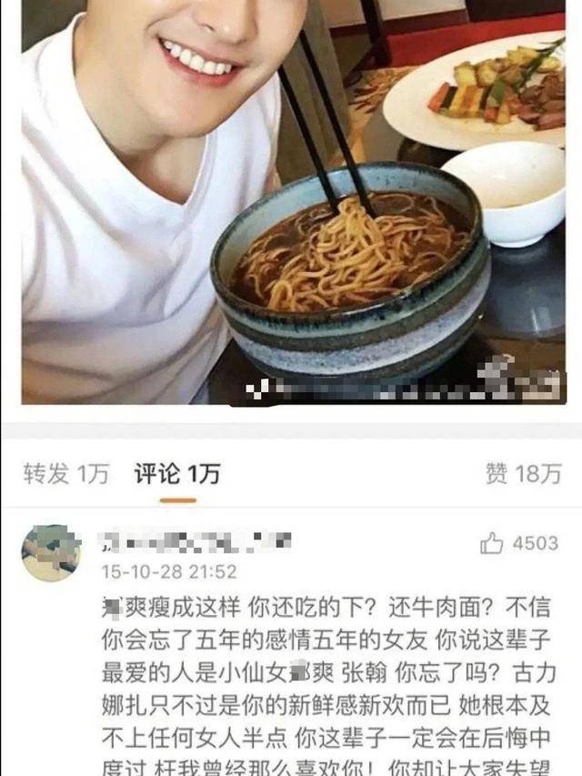 最搞笑的是,分手后张翰发了张吃牛肉面的照片,居然被某爽粉丝骂上热搜,说他“某爽都瘦成那样了,你还有心情吃牛肉面”。