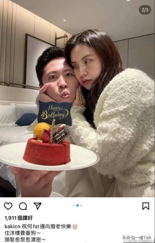 照片里,何伟豪捧着蛋糕,女友捧着何伟豪的脸,两人搞怪又温馨。