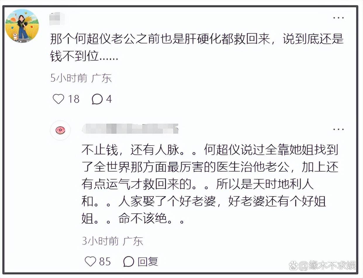 但也有人感慨没钱实在太难了,赌王女婿何超仪的老公之前也是肝硬化,却被救了回来。据悉何超仪丈夫陈子聪患有肝硬化,2016年便已经治愈;之后再次复发动了手术后又恢复了,2025年露面时已经容光焕发。